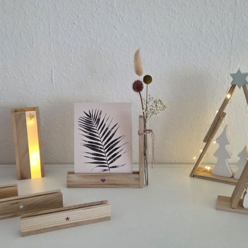 Heute werden wir aus kleinen Holzelementen, im Handel auch als Klötzchen oder Easysticks bekannt, weihnachtliche Dekorationen und Geschenke herstellen. Ein geschmückter Holztannenbaum, Kartenhalter, Serviettenständer etc. – ihr könnt selber entscheiden, welches Projekt ihr umsetzen möchtet. Oder vielleicht werden es ja auch mehrere… Die Objekte können mit rub-on-Stickern, Stempeln und Dekoelementen verziert werden.